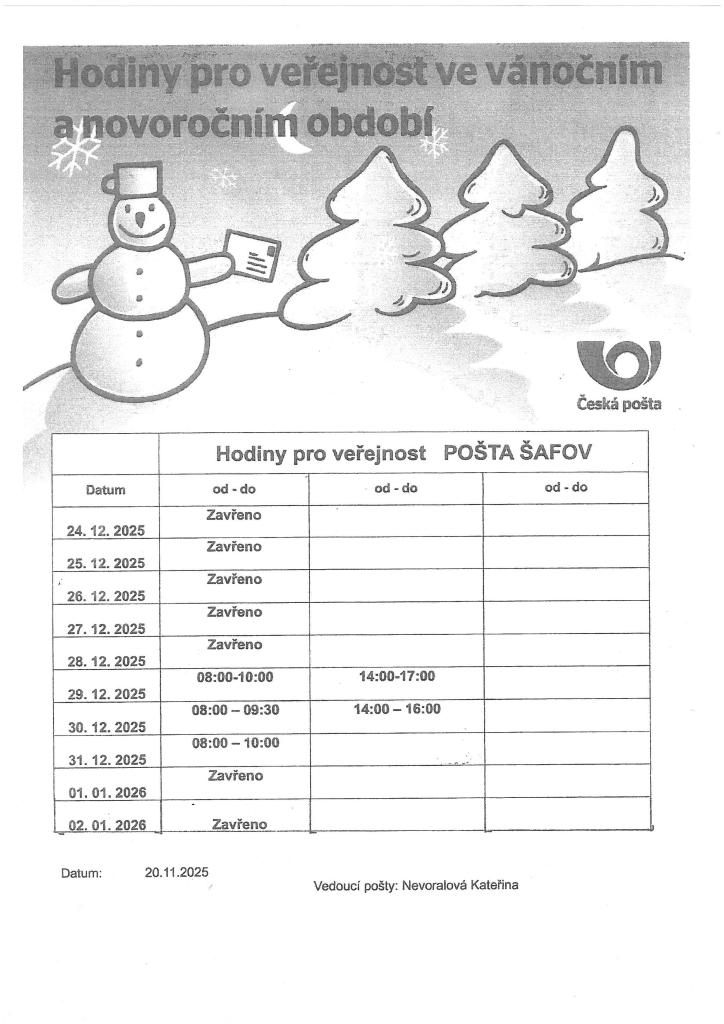 Pošta Safov oznamuje změny v otevírací době během vánočních svátků. V období od 24. do 28. prosince 2025 bude pošta zavřena.